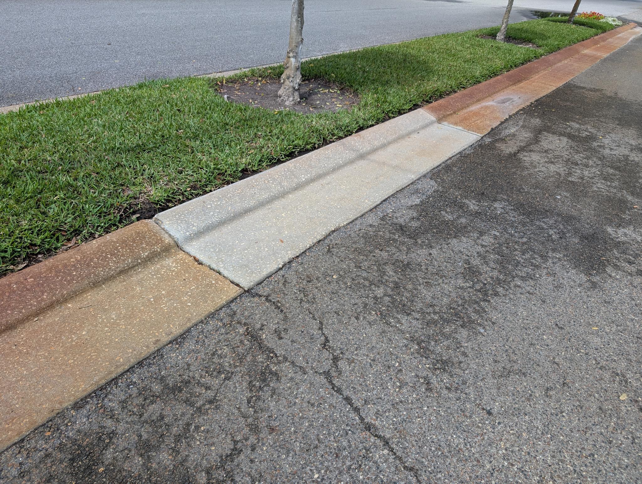 This week  a professional pressure-washing contractor cleaned small areas of the east Phase II entrance wall and median curb to allow us to evaluate the effectiveness of the chemicals and techniques they use. Four areas of the east entrance wall were tested; Areas #1 & #2 were treated for both rust & efflorescence , area #3 was treated for efflorescence only and area 4 was treated only for hard water stains. Areas 3 & 4 had no visible rust deposits before cleaning. A section of the entrance median curb was treated for rust stains.